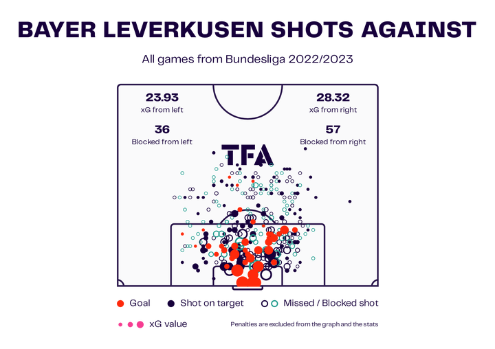 在阿隆索的带领下,防守也得到了明显的改善,勒沃库森的丢球数在德甲联赛中排名第七(49球),相当于每90分钟丢1.34球。不过他们的失球数超过了预期(xG失球数:46.09),这表明他们的防守还有进一步优化的空间。