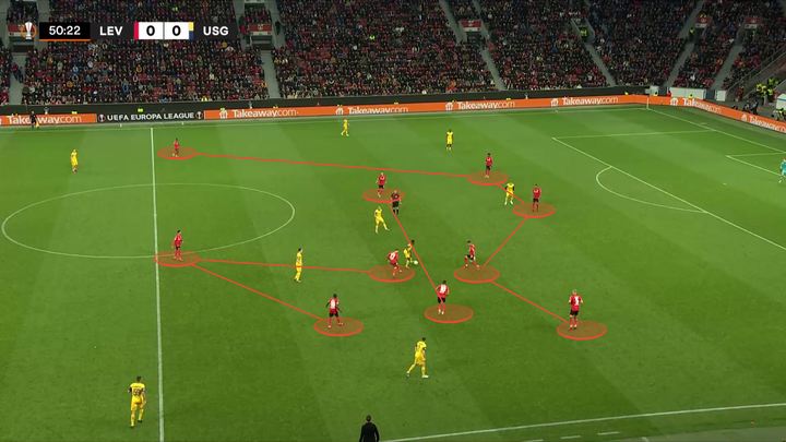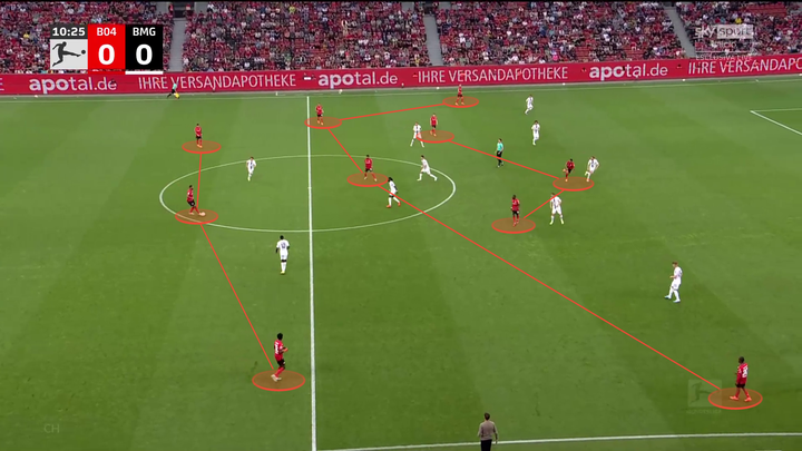 当他们从后场开始进攻时,勒沃库森的三后卫经常转变为双后卫阵型,一名中后卫进入到防守中场区域。边后卫在靠近边线的位置提供传球选择,为球队提供组织进攻所需的宽度和紧凑度。