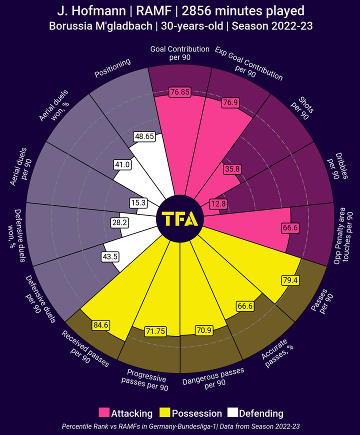 进攻型中场的位置拥有创造力和进球威胁,这是打破对手防守所必需的。阿德利的技术能力、速度和盘带技术使他在侧翼一直是一个威胁。霍夫曼的多样性和中场的进球能力为勒沃库森的进攻增添了更加强大的力量。