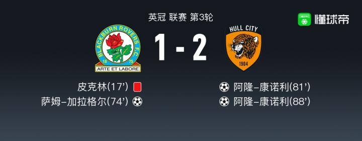 北京时间8月19日英冠 联赛 第3轮,布莱克本流浪者主场对阵赫尔城。布莱克本流浪者萨姆-加拉格尔破门。赫尔城阿隆-康诺利梅开二度。最终比分1-2。