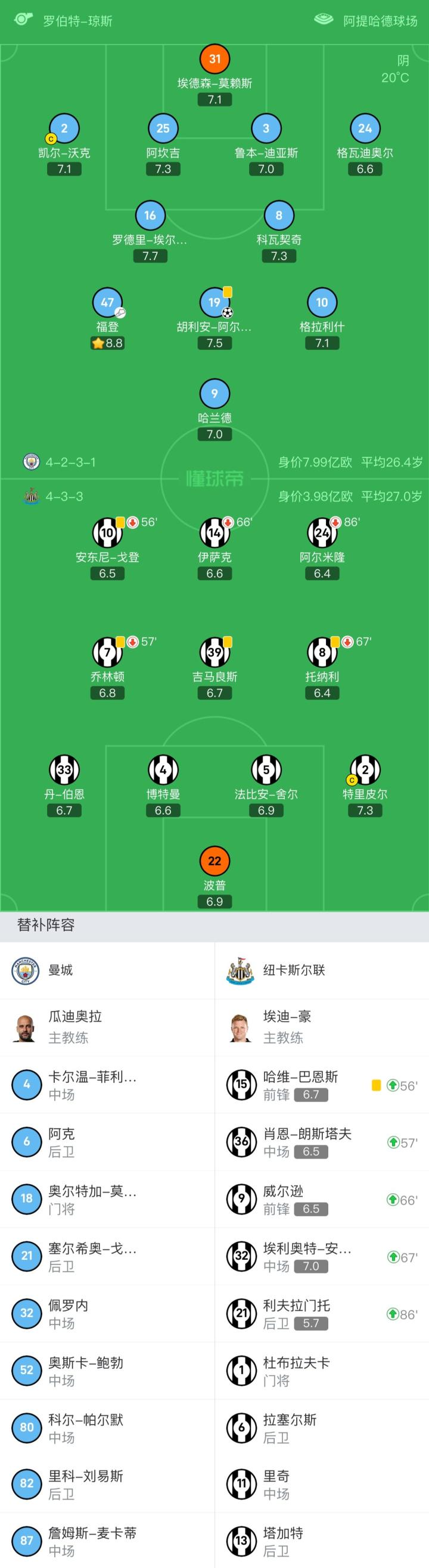 未上场替补:18-奥尔特加、4-卡尔温-菲利普斯、6-阿克、21-塞尔希奥-戈麦斯、32-佩罗内、52-奥斯卡-鲍勃、80-科尔-帕尔默、82-里科-刘易斯、87-詹姆斯-麦卡蒂