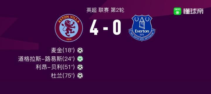 北京时间8月20日英超 联赛 第2轮,阿斯顿维拉主场对阵埃弗顿。阿斯顿维拉麦金破门,利昂-贝利破门,杜兰破门,道格拉斯-路易斯破门。最终比分4-0。