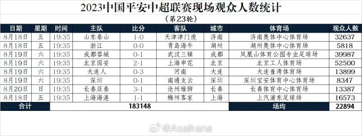 中超第23轮观众数:工体52500人居首,创今年国内足球赛新高盖坦9 @懂球帝2023-08-20 23:39中超第23轮的比赛全部结束,观众人数方面国安主场52500人居首,创今年国内足球赛事新高。本轮平均观众人数为22894人。中超第23轮观众人数数据统计@Asaikana山东泰山vs天津津门虎:32637人浙江vs青岛海牛:5818人成都蓉城vs武汉三镇:39987人北京国安vs上海申花:52500人大连人vs河南:13899人深圳vs南通支云:8347人长春亚泰vs沧州雄狮:13387人上海海港vs梅州客家:16573人展开更多