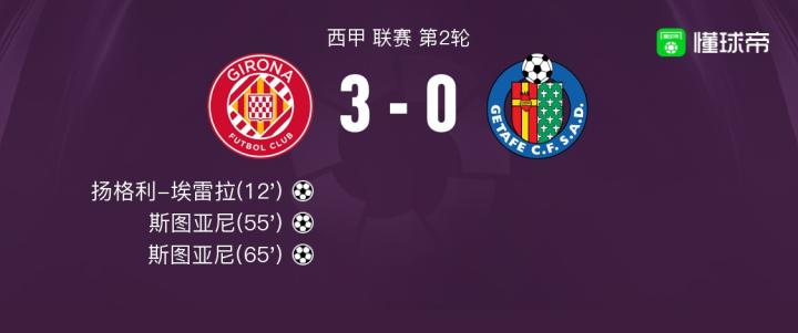 赫罗纳3-0赫塔费获胜,斯图亚尼梅开二度,扬格利-埃雷拉建功
