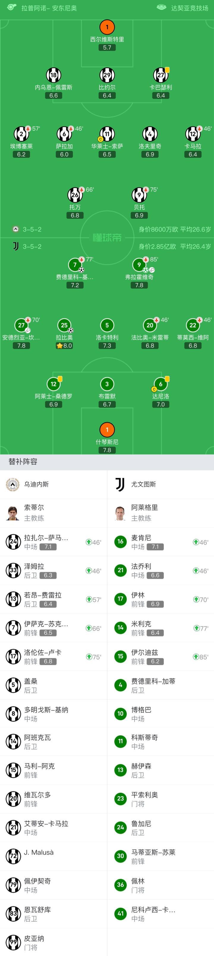 未上场替补:4-费德里科-加蒂、10-博格巴、11-科斯蒂奇、23-平索利奥、24-鲁加尼、30-马蒂亚斯-苏莱、36-佩林、37-赫伊森、41-尼科卢西-卡维利亚