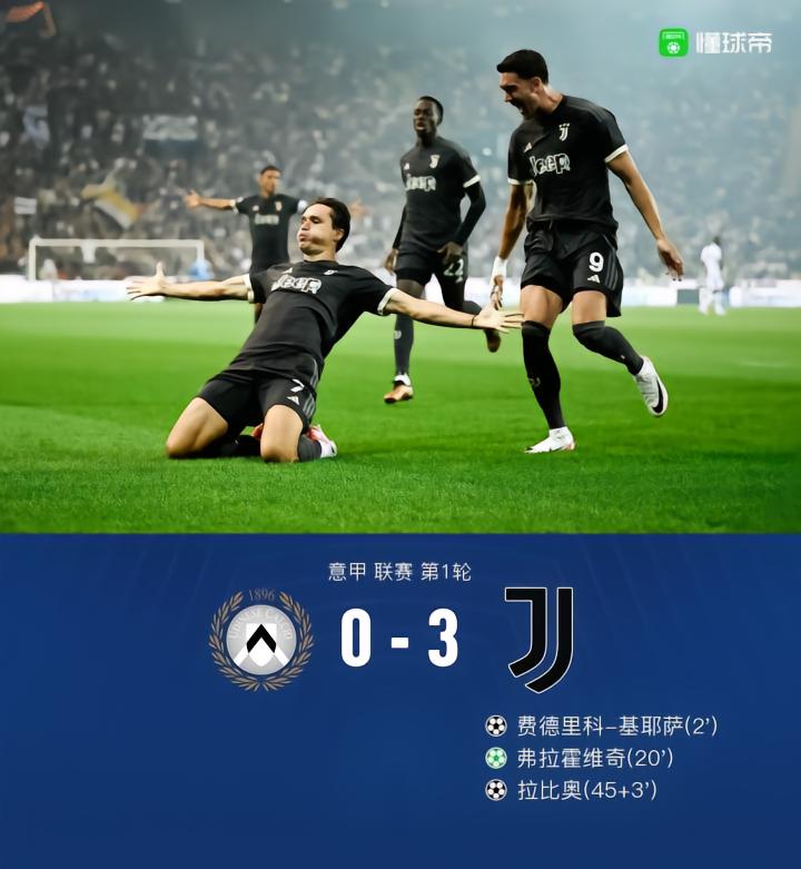 北京时间8月21日2:45,意甲第1轮,尤文图斯客场挑战乌迪内斯。上半场,基耶萨远射破门,弗拉霍维奇点射建功,安德烈亚-坎比亚索助攻拉比奥头球破门。下半场,托万远射打偏,伊林头球攻门顶高,弗拉霍维奇头球破门被吹,最终,尤文客场3-0乌迪内斯。