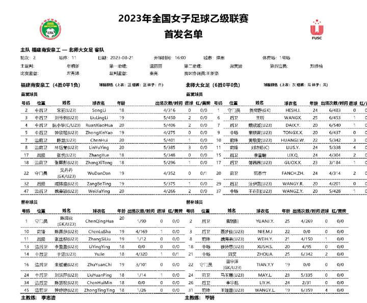 #女乙联赛#排位赛阶段小组赛第2轮 福建南安泉工女足 vs 北京师范大学女足 首发名单