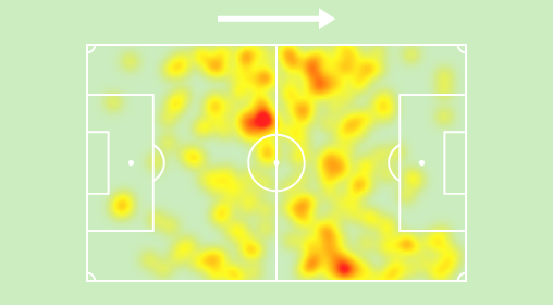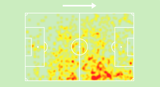 从上面的热图中我们可以看到,他在瓦伦西亚没有在国家队那么自由,所以他更接近球场的右侧。