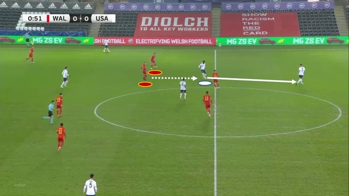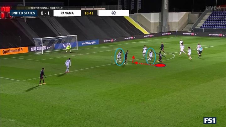 在下面的例子中,我们可以再次看到穆萨的防守站位。当对手试图从后场进攻时,穆萨没有盯防任何人,并为对手轻松的传球留出了空间。对手传球后,他才会做出反应,试图追赶对手,但他已经前插过了中线。如果穆萨在之前往前走一点挡住传球通道,那么他就不需要追球了,但他没有看到对方的传球路线。