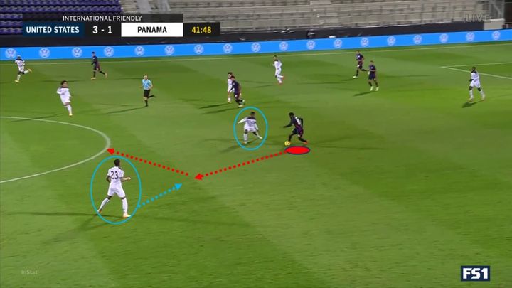 在下面的例子中,穆萨跑向他的防守队友并接球。他有空间转身并尝试推进,但他没有观察身后并将球回传给了中后卫,错过了推进的机会,也不必要地减缓了球队的进攻。