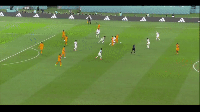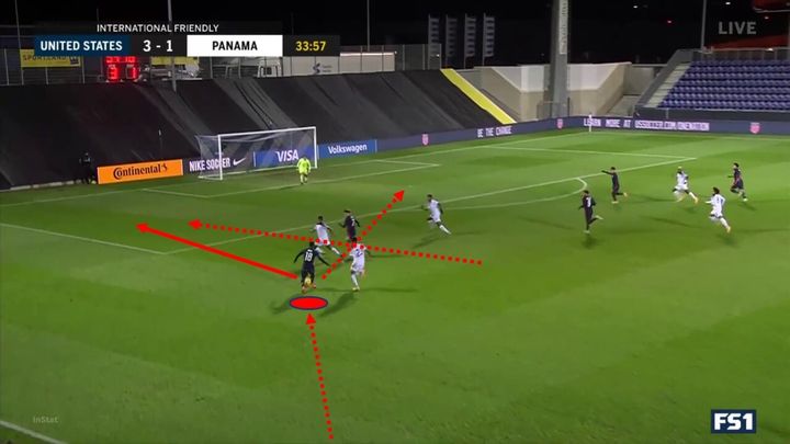 在下一个例子中,穆萨在球场左侧抢到球,并跑向防线。当他的队友开始在中后卫和右后卫之间跑动时,穆萨恰到好处地传球避免了越位。传球后,穆萨继续向前奔跑,到达了点球点。我们可以看到在这里穆萨有足够的视野,在带球跑动时可以看到眼前发生了什么,并做出了合适的传球决策。