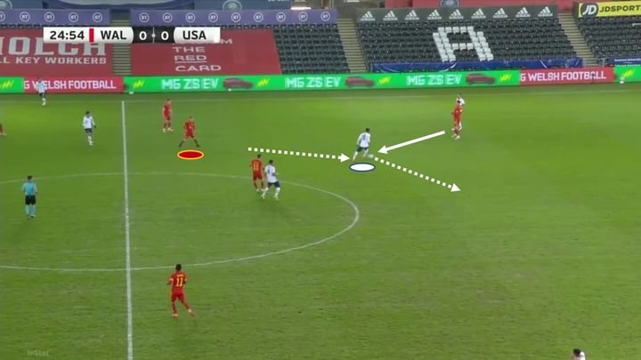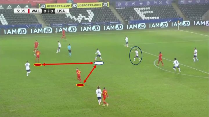 在为美国比赛时,我们可以看到穆萨处于一个更为中路的位置,担任双后腰的一员。在这种战术设置中,他会更多地靠近防守队员帮助防守,也可以出现在两条线之间。他的影响力覆盖了球场上的大部分区域。