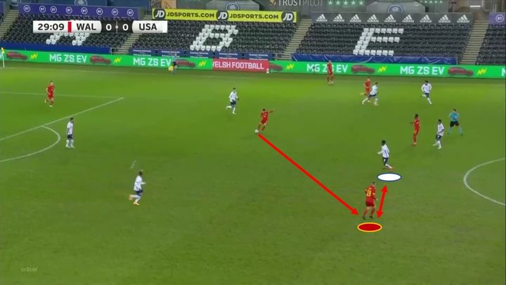 下图中,穆萨在自己的半场接球,并开始向前带球。他突破了中场防线,冲向了对手的后防线。当其中一名防守球员离开自己的盯防对象来压迫他时,他给了右边锋一个简单但非常有效的传球。在这个场景里,穆萨在接到防守球员的球后,自己创造出了一个机会。