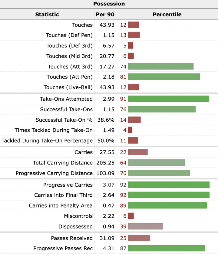 在控球时,穆萨在过人尝试(take-ons attempted)、过人成功率(Successful Take-On %)、侵略性带球(progressive carries)和接收侵略性传球(progressive passes received)上表现出色。