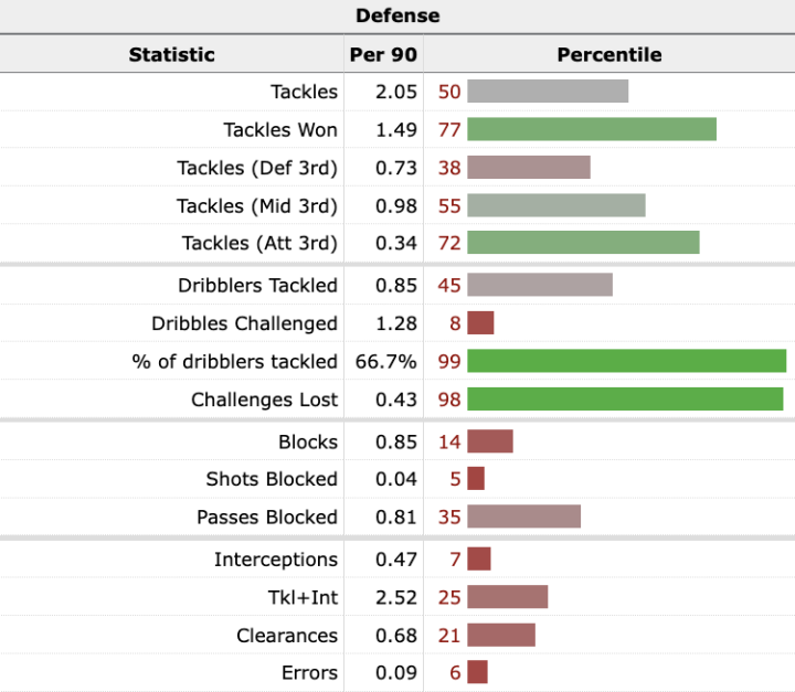 如果我们看FBRef的百分比数据,穆萨与欧洲五大联赛中的其他中场球员进行了比较,我们会发现他在成功铲球(tackles won)、抢断对方带球(dribblers tackled)和对抗失败(challenges lost)(数字越低越好)方面排名靠前,但在封堵(blocks)、拦截(interceptions)、解围(clearances)和失误方面,他是最差的之一。