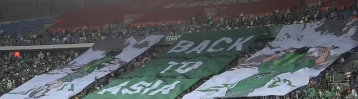 在看台上还出现了“Back to Asia(重返亚洲赛场)”的巨幅TIFO,一位年轻球迷的背影和一位父亲背着孩子共同为球队助威的动漫形象,彰显了浙江足球队悠久的历史,也展示了球迷等待了12年但始终与球队并肩作战,不离不弃的决心与忠诚。