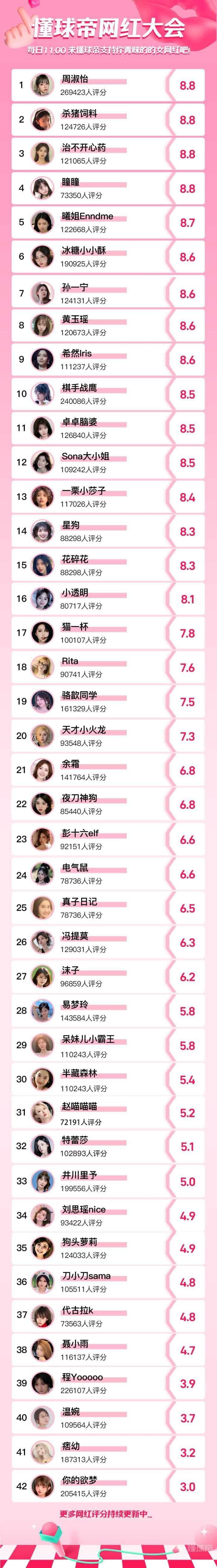 当前我懂老哥对各大网红们的喜爱值如下,谁最让你意外?你最中意的女网红是哪个?欢迎大家在评论区提名,活动君将会根据大家的提名结果判断采纳哦!