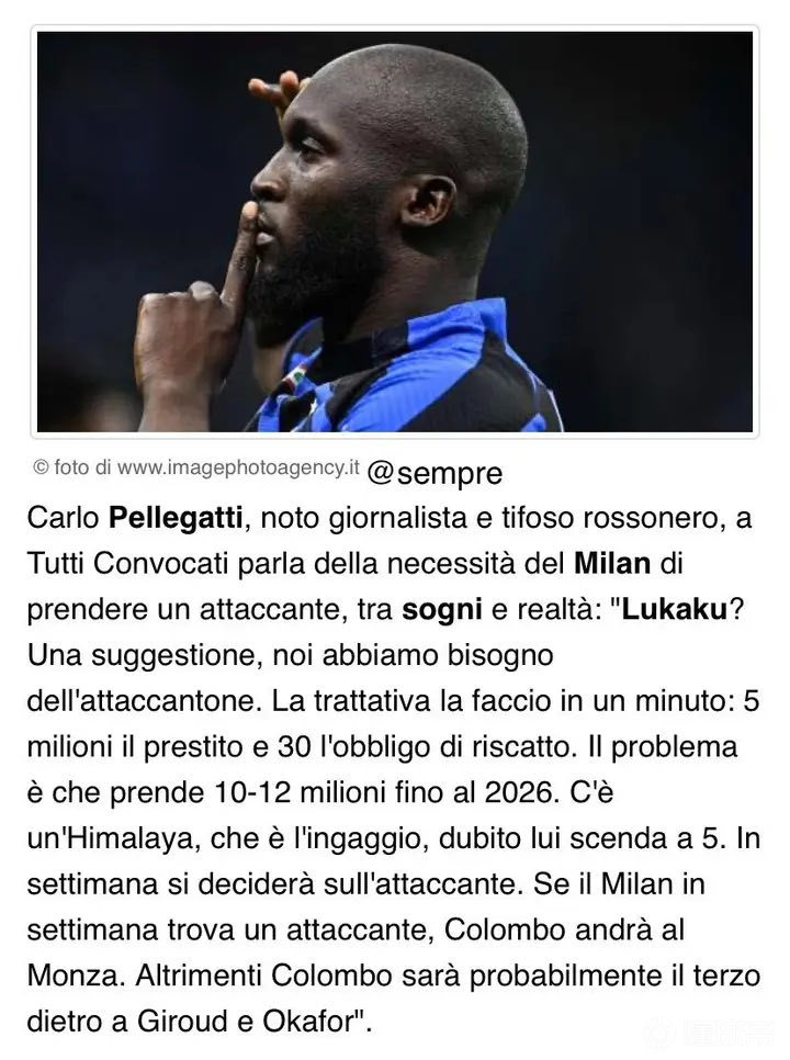 佩莱加蒂:如果是我,就会立即就卢卡库进行谈判,5M租借+30M强制购买 面对Tutti Convocati,佩莱加蒂谈及了米兰在理想与现实之间需要签下一名前锋的问题:“卢卡库?这是一个建议,我们需要前锋,我马上就进行谈判:5M租借+ 30M强制购买。问题是他在2026年之前每年薪水10-12M。这是一个很难的障碍。我对他会降到5M表示怀疑。在本周米兰将对前锋作出决定。如果米兰本周找到一名前锋,科隆博将前往蒙扎。否则科隆博可能会排在吉鲁和奥卡福之后作出第三前锋。”