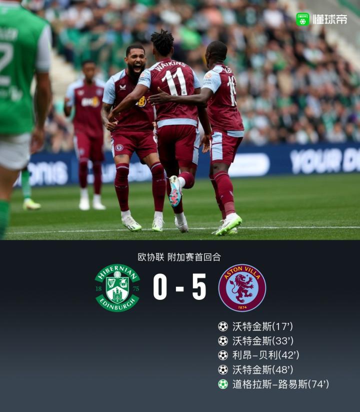 阿斯顿维拉5-0希伯尼安,沃特金斯戴帽,利昂-贝利建功
