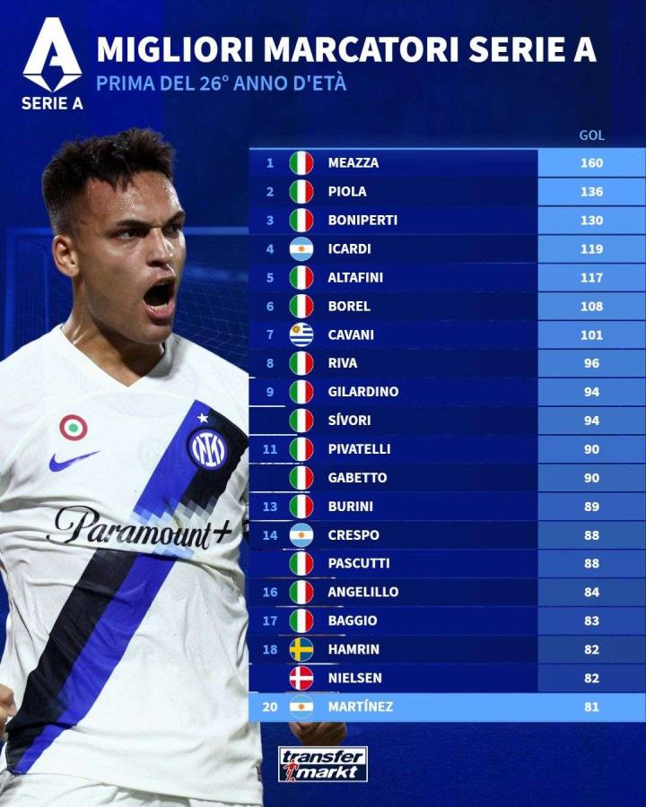 国际米兰前锋劳塔罗26岁攻入81粒意甲进球,在小...迷妹爱国米 @懂球帝2023-08-24 16:39国际米兰前锋劳塔罗26岁攻入81粒意甲进球,在小于等于26岁球员取得意甲进球数排行榜中排名第20。劳塔罗的进球数据还是可以的,他曾经的大哥伊卡尔迪排名第4也是真的强。展开更多