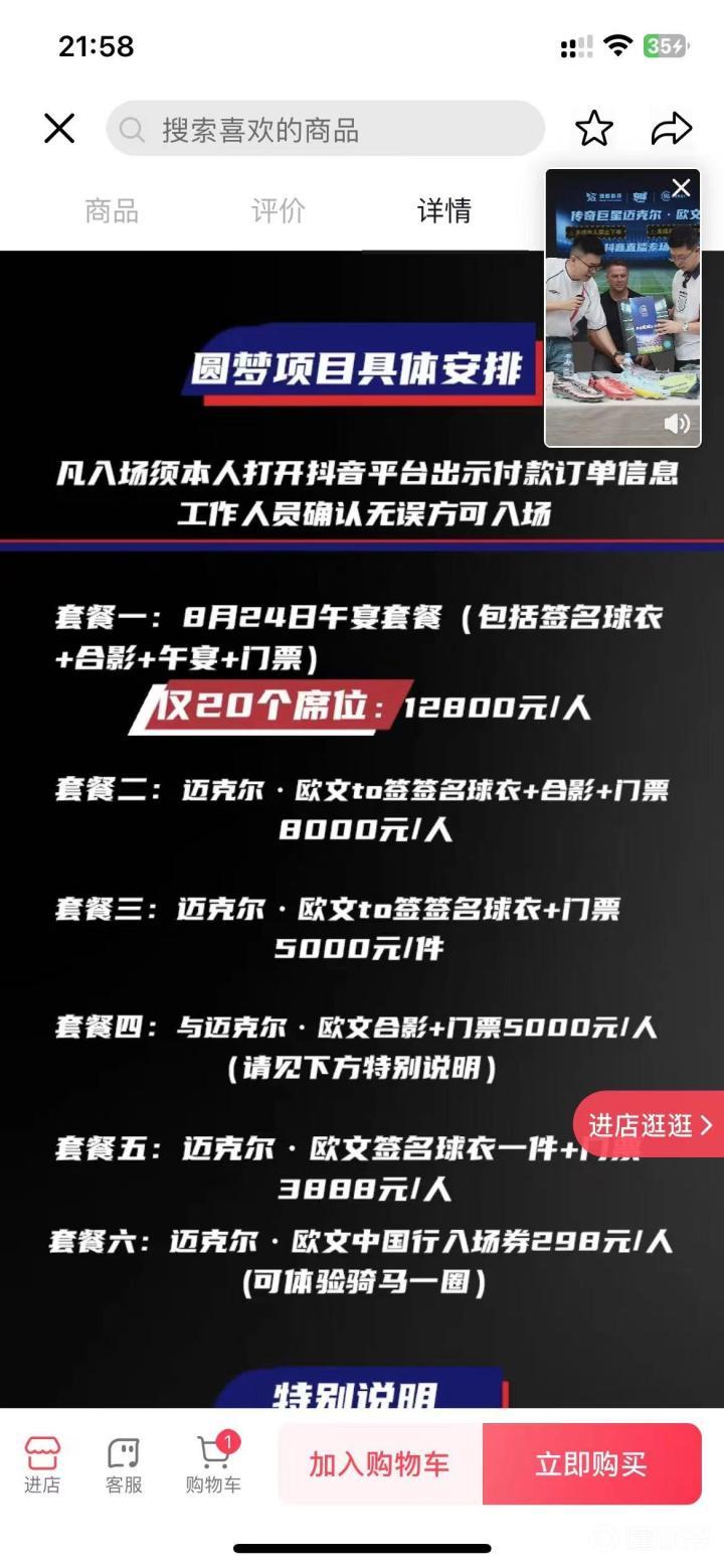 英格兰传奇球星欧文昨天来到解说员于鑫淼的抖音直播间参加活动,在抖音商城中可以看到欧文这次中国行球迷见面的费用,其中包含合影的项目最便宜的价格为5000元人民币。