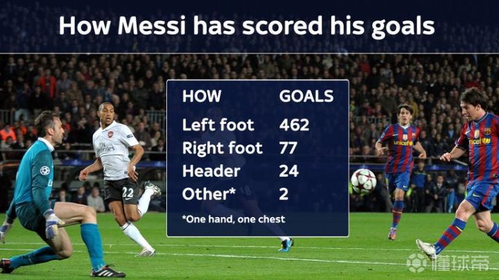 职业生涯中,梅西已经用左脚打进了462球,这占到了他总进球数的82%。此外,梅西的77个进球来自于右脚,24个球用头打进,还有2个是用身体其他部位打进的(一个手球,一个胸部)。
