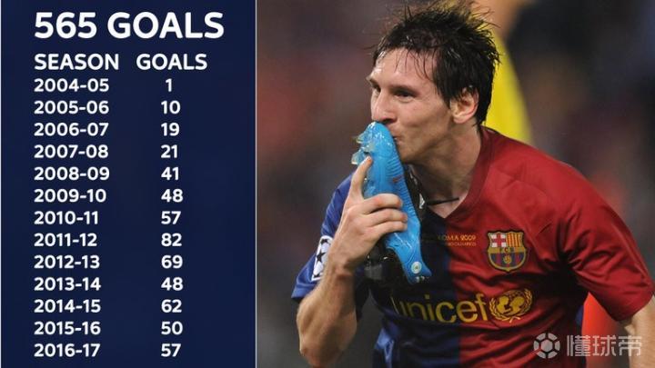 自从2008-09赛季以来,梅西在俱乐部和国家队的总进球数都超过了40个。看起来梅西还没有任何衰退的迹象,刚刚过去的这个赛季梅西打进57球,这一数字可以排在他职业生涯单赛季进球数的并列第四位。