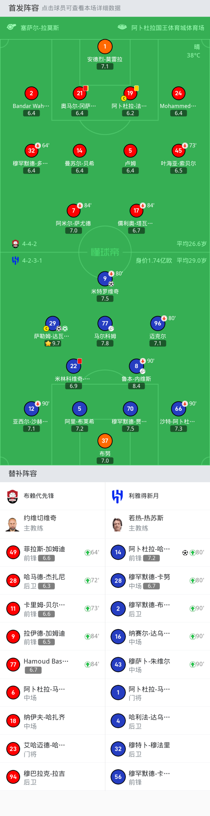 利雅得新月替补:1-马约夫、2-穆罕默德-布莱克、4-哈利法-达乌萨里、14-阿卜杜拉-哈姆丹、16-纳赛尔-达乌萨里、28-穆罕默德-卡努、32-穆法里、43-穆萨卜-朱维尔、56-穆罕默德-卡赫塔尼