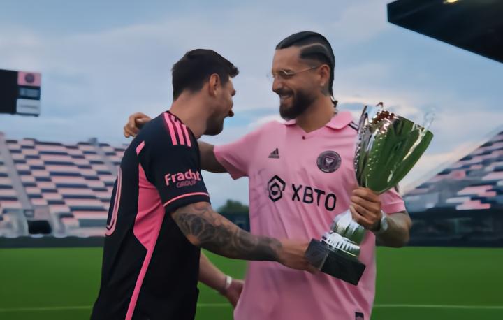 在MV中梅西在DRV PNK体育场身穿迈阿密国际球员,向马卢玛颁发了奖杯。