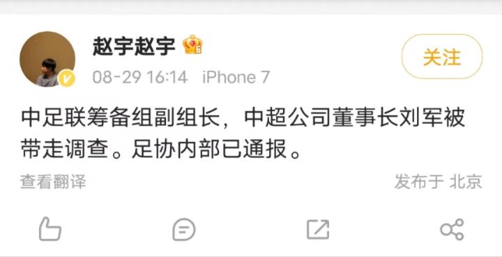 8月29日,足球记者赵宇爆料,中足联筹备组副组长,中超公司董事长刘军被带走调查,足协内部已通报。