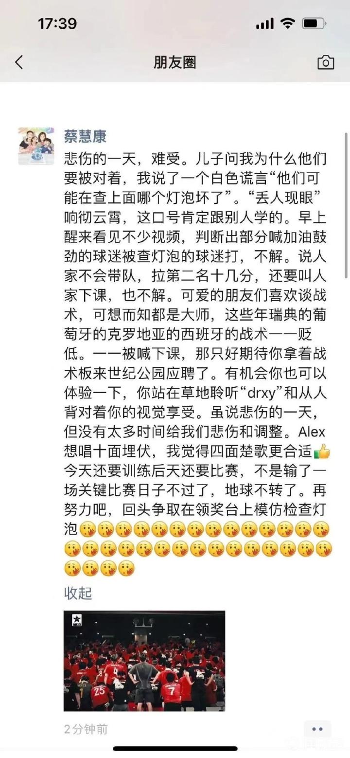 “虽说悲伤的一天,但没有太多时间给我们悲伤和调整。Alex想唱十面埋伏,我觉得四面楚歌更合适。今天还要训练后天还要比赛,不是输了一场关键比赛日子不过了,地球不转了。再努力吧,回头争取在领奖台上模仿检查灯泡。(还配上了多个打脸的表情)”