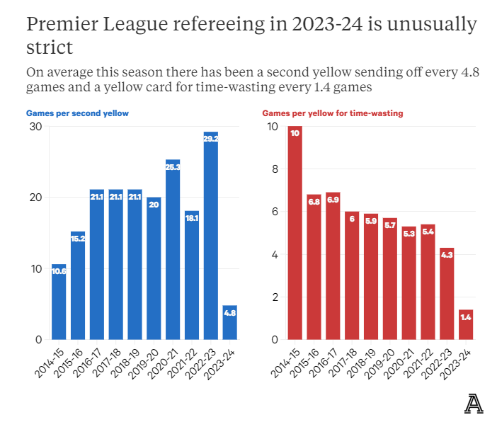 本赛季迄今为止进行了19场比赛,左图显示本赛季平均每4.8场就有一名球员两黄一红下场,同样远远低于前9个赛季的平均值20.2场。