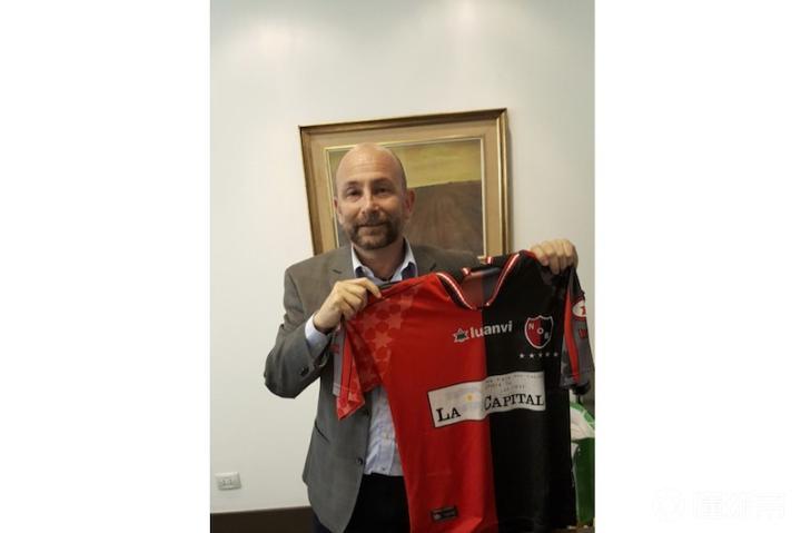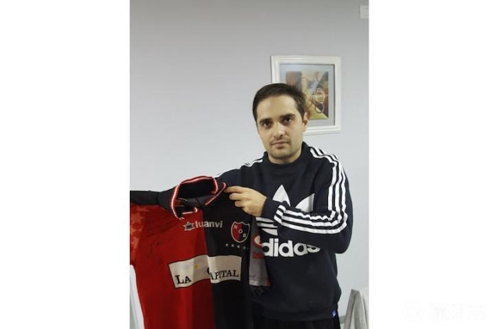 法雷诺尼拿着有梅西签名的纽维尔老男孩队球衣