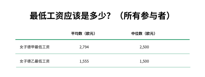根据Sportschau的调查结果显示,女足球员们对于最低工资的要求有相似的想法,平均而言,女足德甲球员希望的最低工资为每月2,794欧元,女足德乙球员则希望的最低工资为每月1,555欧元。在稍具代表性的中位数上,女足德甲球员的最低工资应为每月2,500欧元,女足德乙球员的最低工资应为每月1,500欧元。中位数表示将所有数值按大小排列,位于中间位置的值,一半的数值小于或等于该值,另一半的数值大于或等于该值。