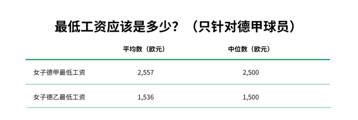 来自女子德乙的球员在调查中占据了62%的比例,德乙球员对于德甲球员的薪资要求更高,她们希望德甲球员的最低工资能够比她们高出约400欧元。
