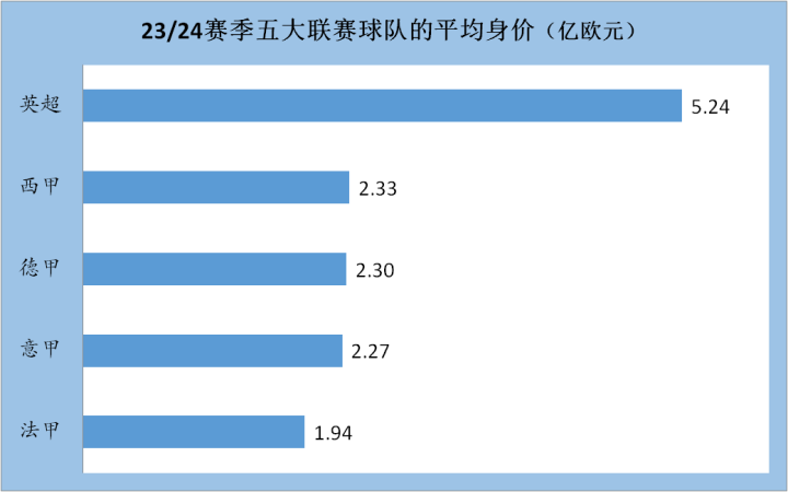 位列二到五位的分别是西甲、意甲、德甲和法甲。在平均身价方面,德甲以2.3亿欧元的球队平均身价超过意甲位列第三。