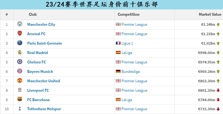 新赛季世界足坛身价排名首位的球队依旧是众星云集的曼城,蓝月亮以12.4亿欧元的总身价领先阿森纳3000万欧元位居第一,而目前也只有曼城和阿森纳在新赛季的球员总身价可以超过10亿欧元。