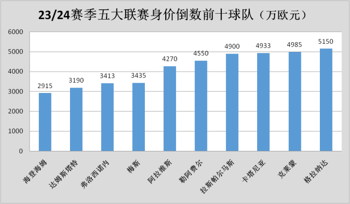 法甲和西甲各有3支球队的总身价位列五大联赛身价榜倒数前十名。