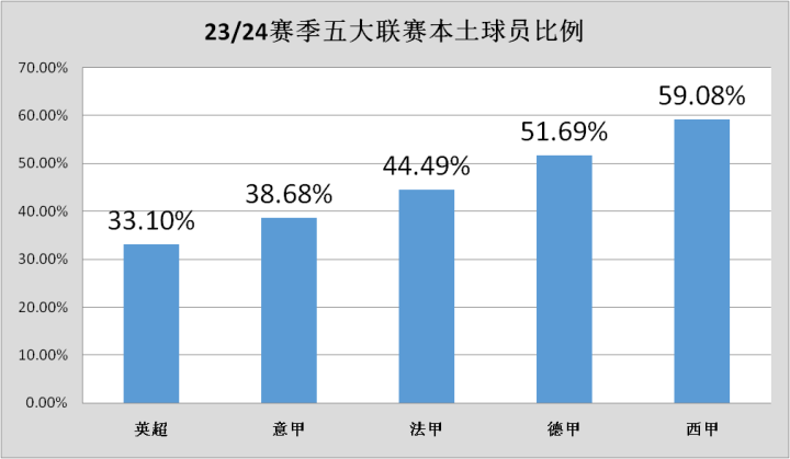 本赛季五大联赛中本土球员比例最高的是西甲联赛(本土球员比例59%),新赛季的五大联赛中只有西甲和德甲的本土球员超过了50%。