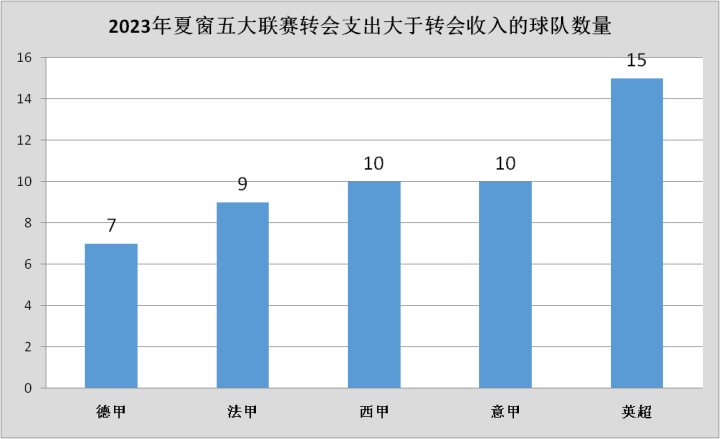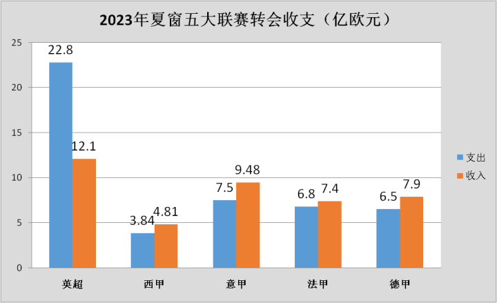 五大联赛在今年夏窗中只有英超联赛的转会支出大于转会收入,其他四大联赛在总体的转会收支中都收获了转会利润。