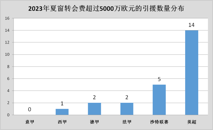 法甲和德甲则各有两位新援的转会费超过5000万欧元,西甲只有皇马引进贝林厄姆时的转会费超过5000万欧元。