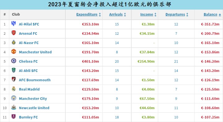 沙特联赛也有3家俱乐部的转会净投入超过1亿欧元,其中利雅得新月的转会投入目前依旧领跑夏窗。