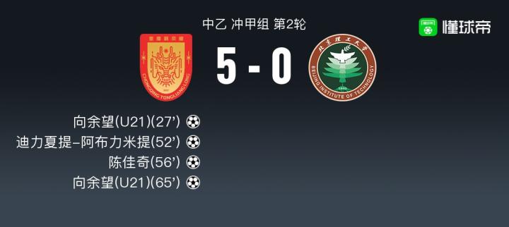 重庆铜梁龙5-0大胜北京理工,向余望梅开二度,陈佳奇建功