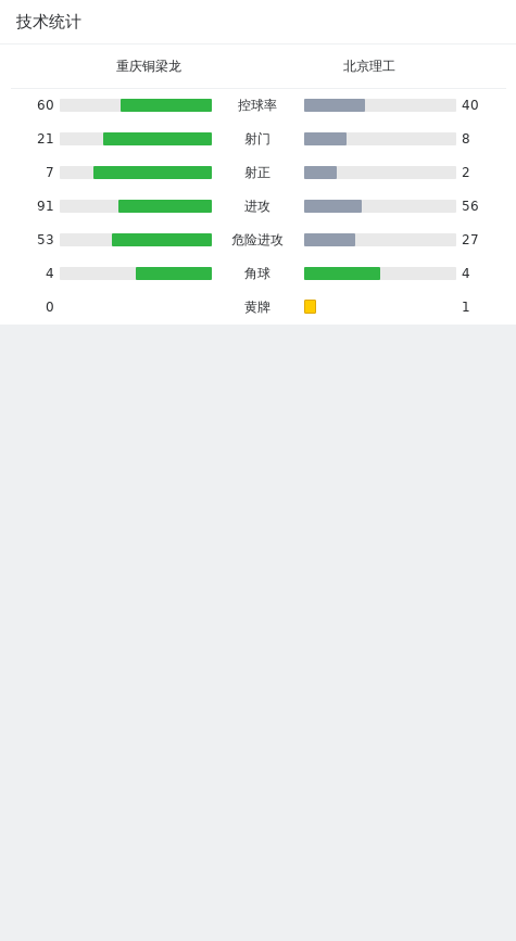 北京时间8月26日中乙 冲甲组 第2轮,重庆铜梁龙主场对阵北京理工。重庆铜梁龙向余望梅开二度,迪力夏提-阿布力米提、陈佳奇、王维成破门。最终比分5-0。
