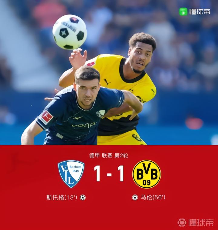北京时间8月26日21:30,德甲第2轮,多特奔赴客场挑战波鸿。上半场比赛,维特克助攻斯托格得分,霍夫曼头球击中横梁,多特暂时未威胁到波鸿大门;下半场,布兰特分球马伦低射扳平比分。埃姆雷-詹染黄,双方各一次中柱。最终,多特客场1-1战平波鸿。