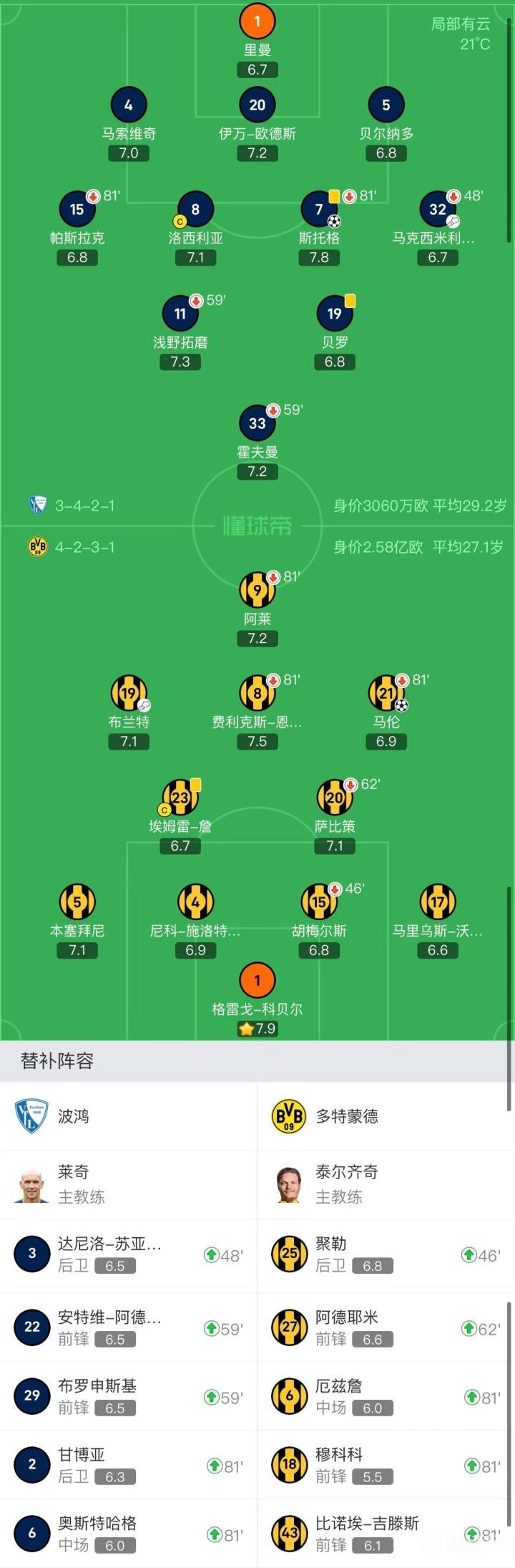 多特首发:1-格雷戈-科贝尔、4-尼科-施洛特贝克、5-本塞拜尼、8-费利克斯-恩梅加(81'6-厄兹詹)、9-阿莱(81'18-穆科科)、15-胡梅尔斯(46'25-聚勒)、17-马里乌斯-沃尔夫、19-布兰特、20-萨比策(62'27-阿德耶米)、21-马伦(81'43-比诺埃-吉滕斯)、23-埃姆雷-詹