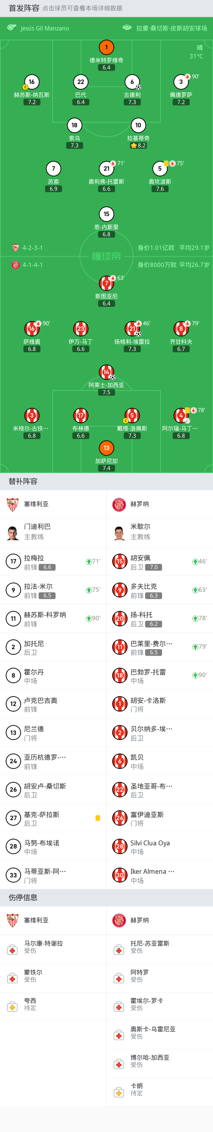 塞维利亚首发:赫苏斯-纳瓦斯, 拉基蒂奇, 古德利, 德米特罗维奇, 奥坎波斯, 苏索, 奥利弗-托雷斯, 索乌, 佩德罗萨, 恩-内斯里, 巴代