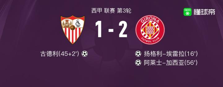 北京时间8月27日西甲 联赛 第3轮,塞维利亚主场对阵赫罗纳。塞维利亚古德利破门。赫罗纳扬格利-埃雷拉破门,阿莱士-加西亚破门。最终比分1-2。