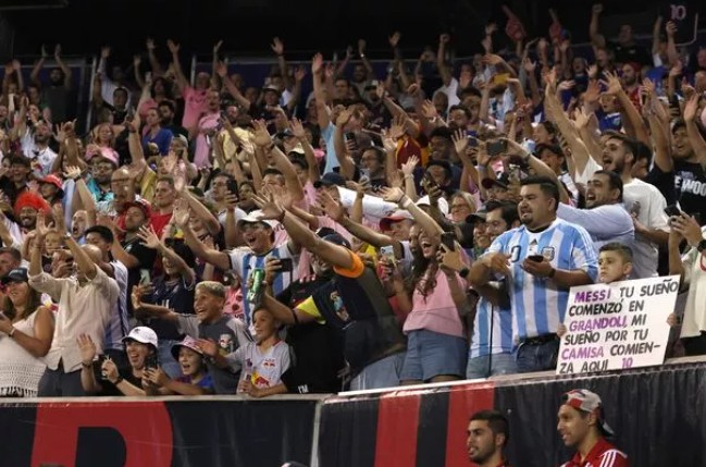 比赛开始以前,从曼哈顿前往新泽西的火车上挤满了人,从世界各地来的球迷身穿着迈阿密国际、巴塞罗那、阿根廷和自制的梅西球衣跳上了火车。
