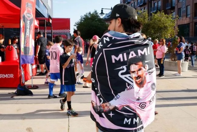 球场外一个画面可能比较说明问题,一位纽约红牛的球迷父亲带着三个儿子,但是儿子们却都穿着梅西的迈阿密球衣。